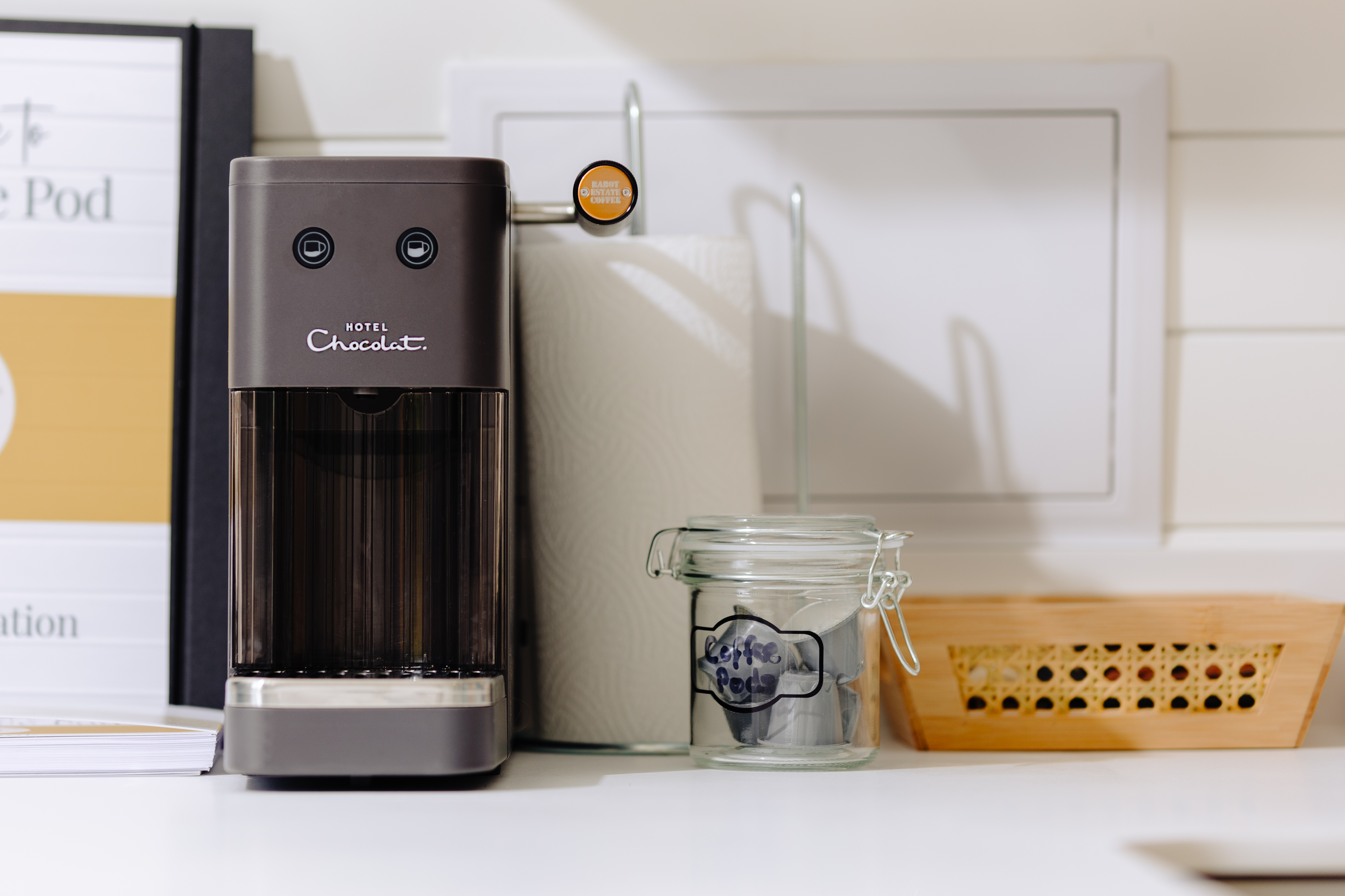 Accommodation comprises: Open Plan Living Area with sofa and smart TV, Kitchenette with breakfast bar, fridge, microwave oven, Nespresso coffee machine, kettle, toaster and hob.